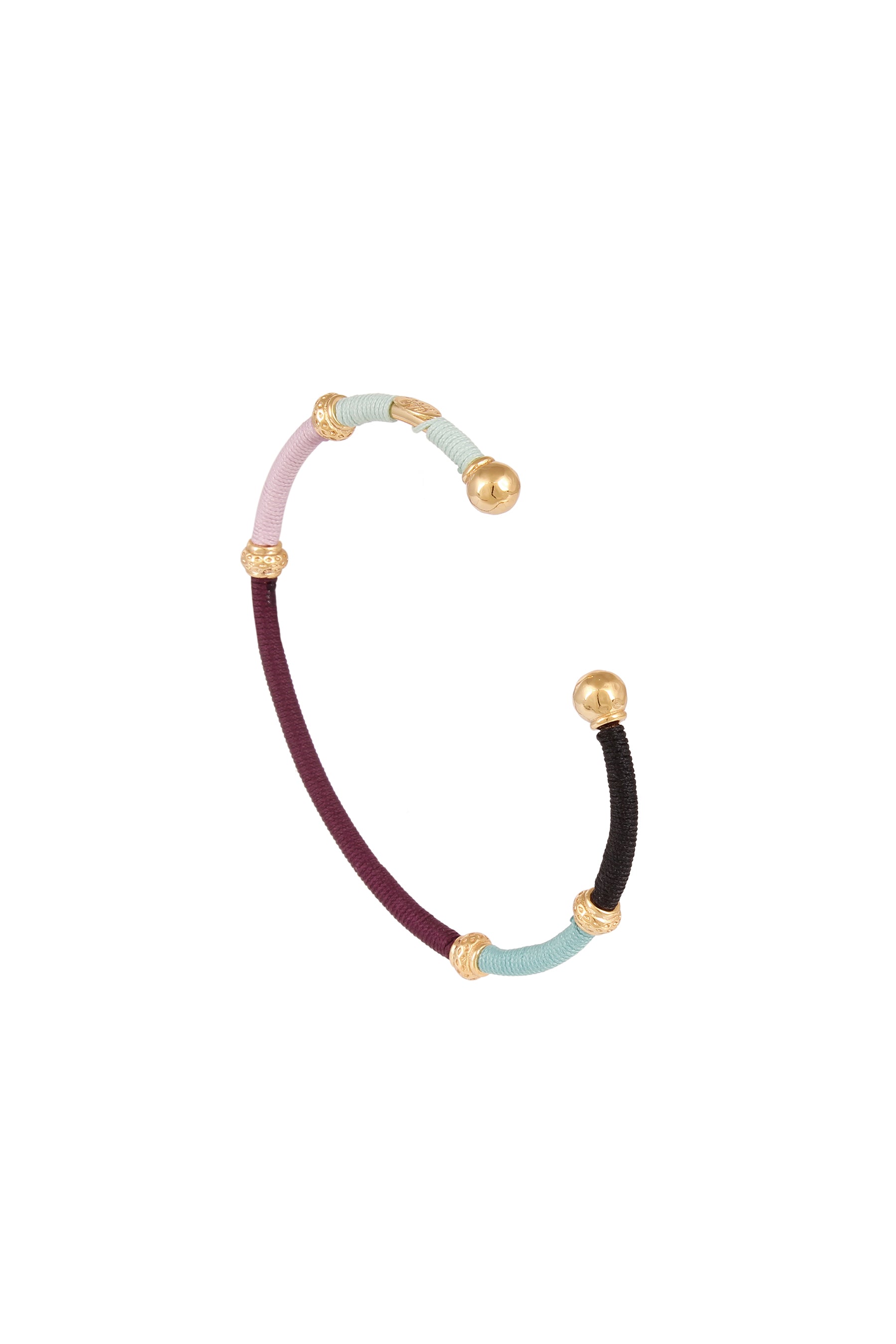 Gold plated bangle, wrapped in part by cotton threads. You can stack it with other bracelets to create a summery arm candy. Adjustable size.